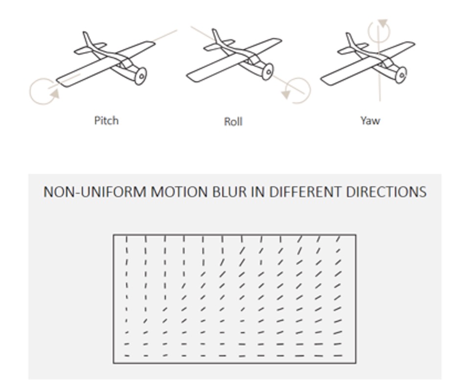 In real flight, all three occur together. The result is spatially varying blur with every part of the image blurred differently.